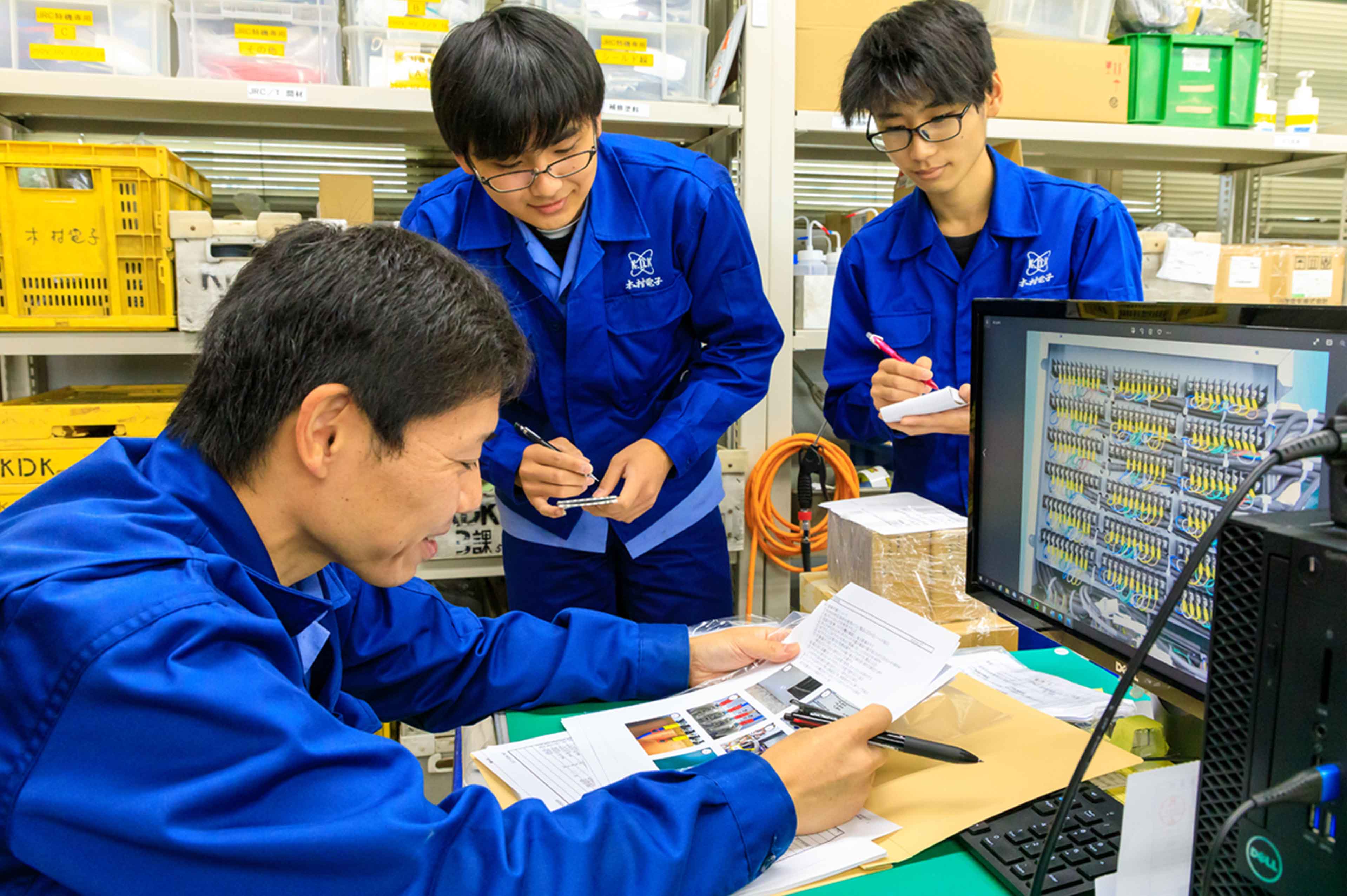 組立配線をはじめ、ものづくりはとてもやりがいがあり、技術者としての成長が自分の誇りになります。そのためには、入社して2~3年は野球でいう素振りなどの基礎練習的な日々を過ごし、手先の感覚や思考力を身に着ける必要があります。課題に対して、根気よく取り組め、達成感を感じたい方はとても向いています!